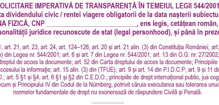SOLICITARE IMPERATIVĂ DE TRANSPARENȚĂ în temeiul Legii nr. 544/2001 privind plata dividendului civic / rentei viagere obligatorii, începând cu data nașterii subiectului juridic – PERSOANA FIZICĂ, CNP ______________, ens legis, cetățean român, titular al personalității juridice recunoscute de stat (legal personhood), și până în prezent.